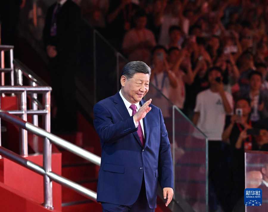 11月9日晚,中共中央總書記、國家主席、中央軍委主席習近平在廣東省廣州市出席中華人民共和國第十五屆運動會開幕式并宣布運動會開幕。這是習近平在主席臺上向大家揮手致意。新華社記者 謝環馳 攝