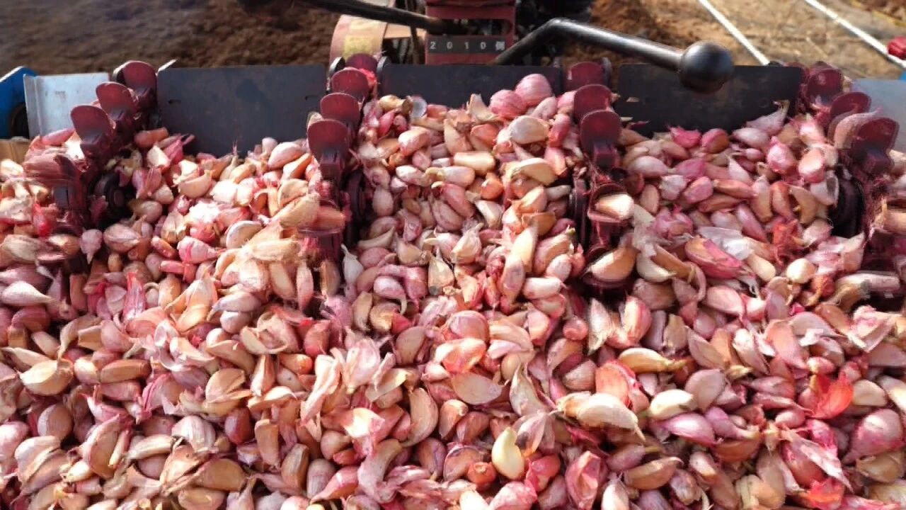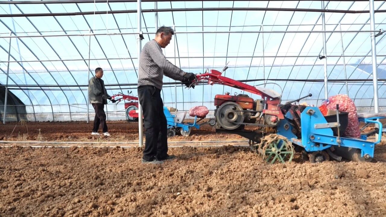 在350米長的標準大棚內(nèi),一條專用軌道貫穿其中,裝載著蒜種的鐵板車在軌道上平穩(wěn)運行,為播種機械持續(xù)供料。技術(shù)員們精準操控著機器,確保每一顆蒜種都均勻植入土中。機械播種過后,后續(xù)的滴灌帶鋪設(shè)和覆膜工作也將依次進行,整個流程環(huán)環(huán)相扣,高效而規(guī)范。